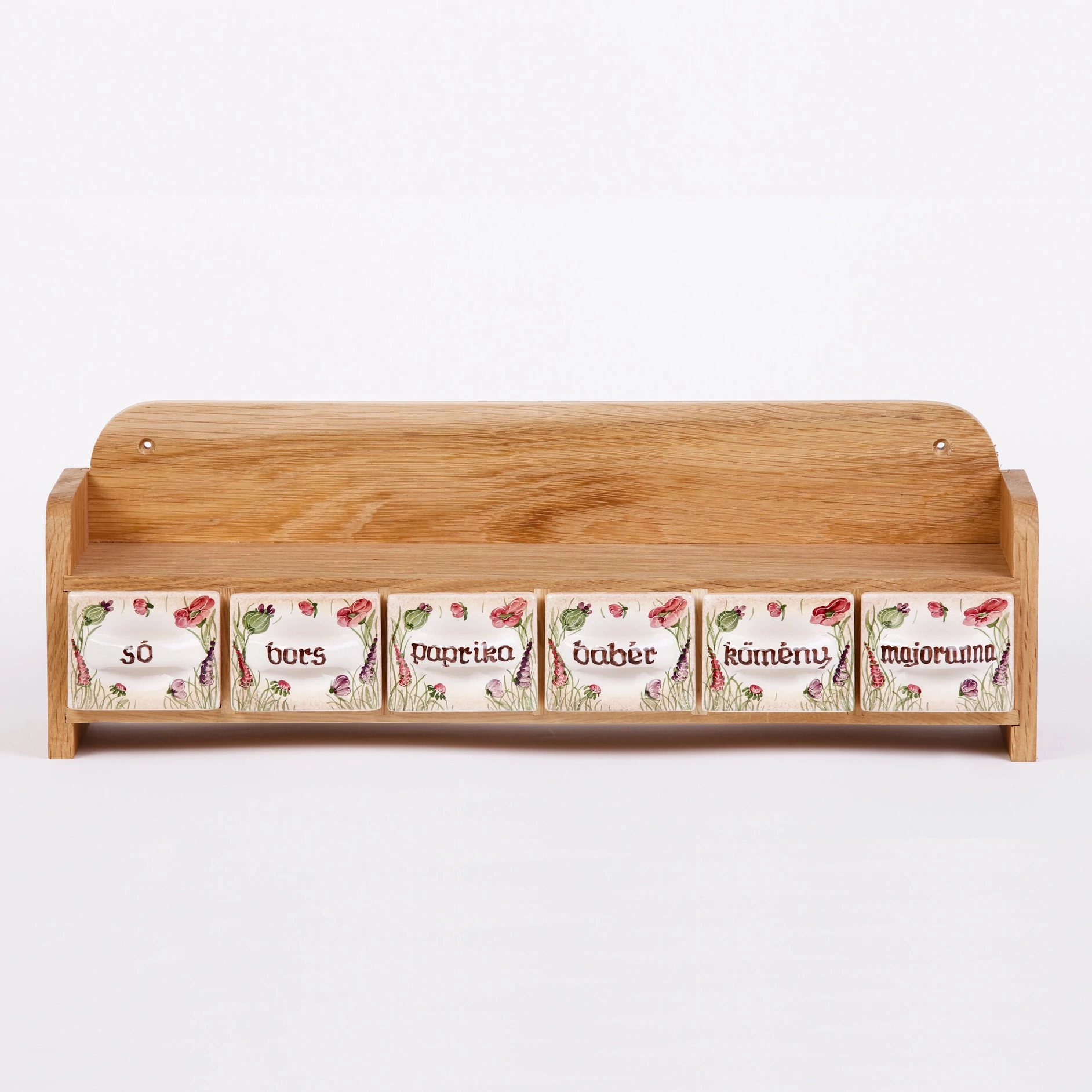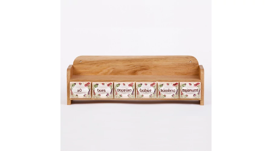 Fiókos fűszertartó pipacsos mintával, 6 kerámia fiókkal, amelyeket az Ön igénye szerinti feliratokkal festünk meg. Egy fűszer fiók körülbelül 15-20 dkg fűszer tárolására alkalmas. Bükkfából készült, pácolt tartóval. Méretei: szélesség 50 cm, magasság (hátlappal) 17 cm, mélység 14 cm. A kerámia fűszer fiókok külön is megvásárolhatóak. |