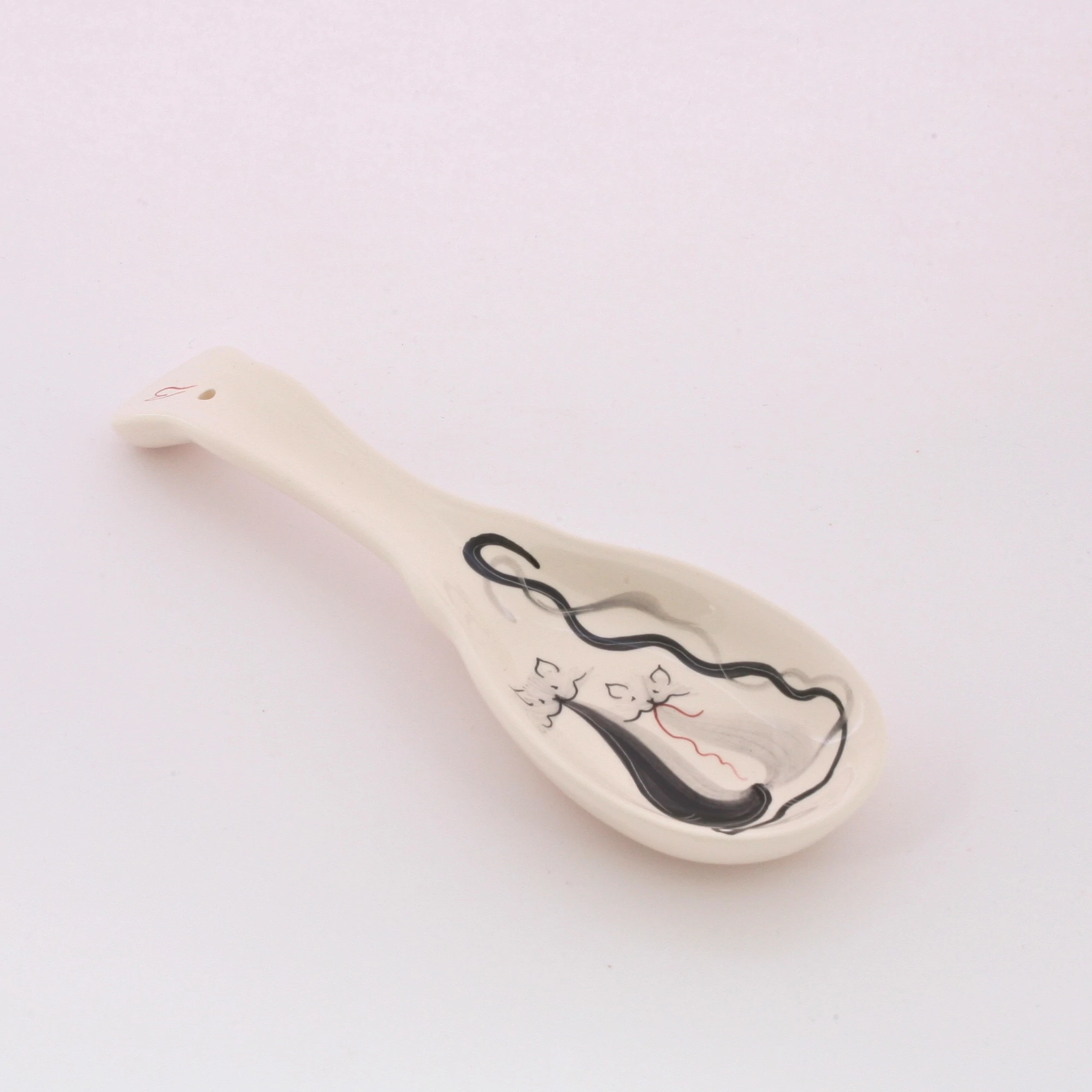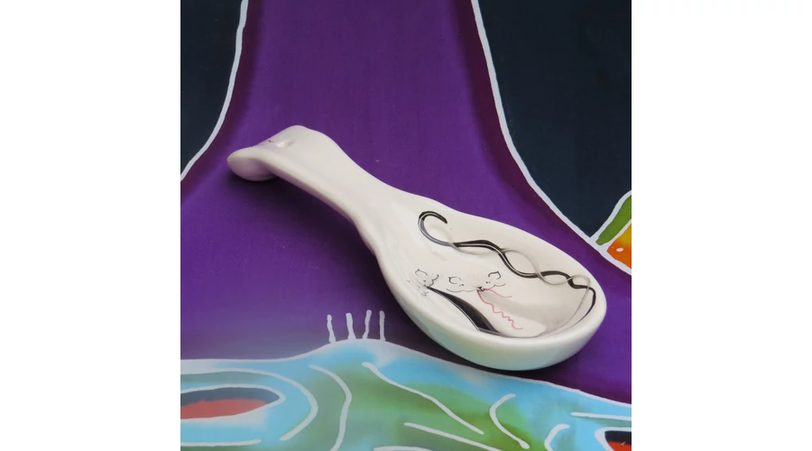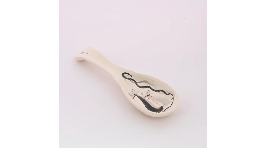 Fekvő kerámia fakanáltartó kanál formájú, kézzel festett cicás mintával. Hosszúsága 23 cm. Praktikus kiegészítő konyhájába.