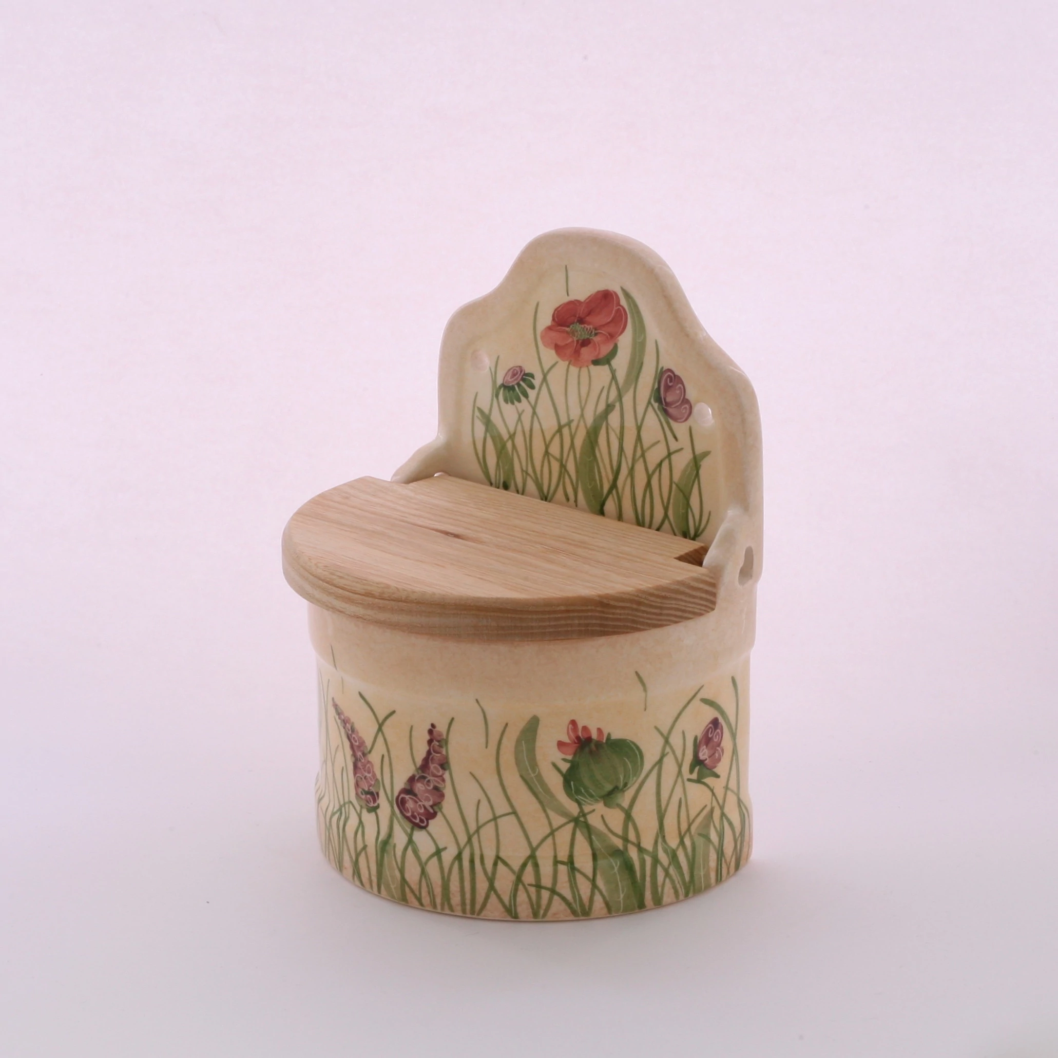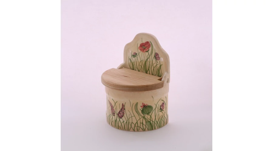 Kerámia sótartó pipacsos mintával, kb 0,5 kg fűszerhez, felhajtható bükkfa tetővel, régi időket idéző formával. Önállóan is nagyszerű ajándékötlet. |