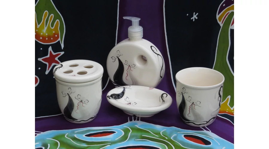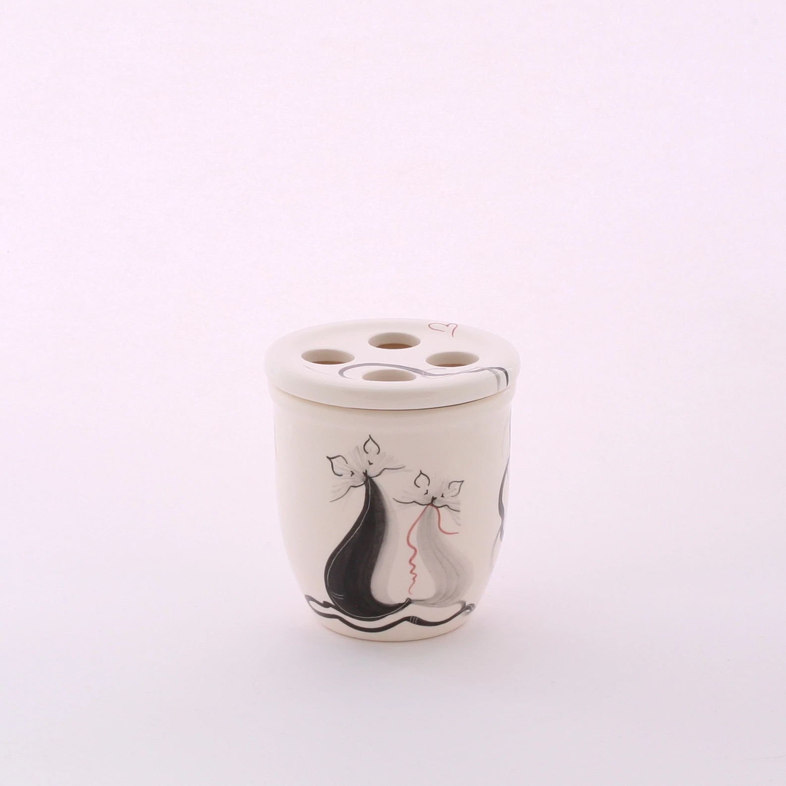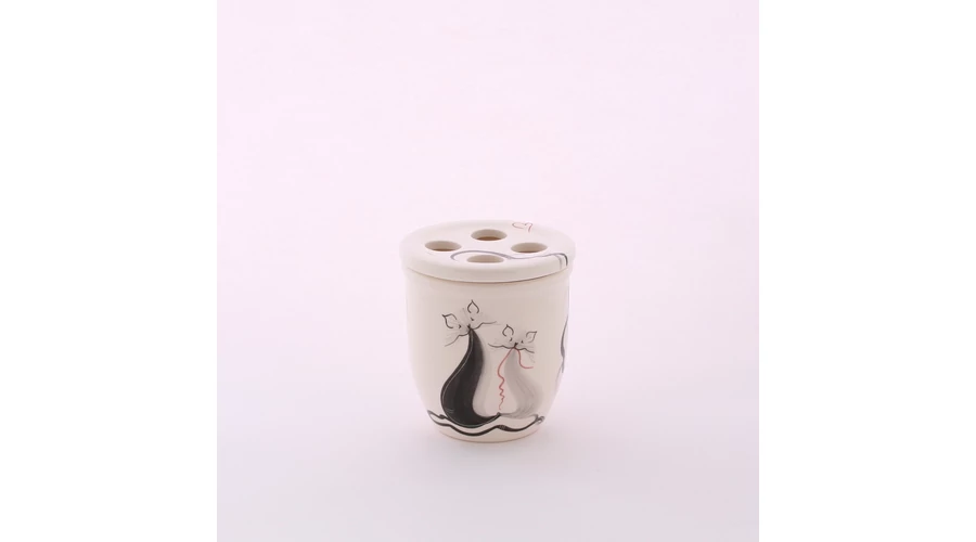 Kézzel festett kerámia fogkefetartó cicás mintával, levehető tetővel. Magassága 10 cm, négy fogkefe elhelyezésére alkalmas. |