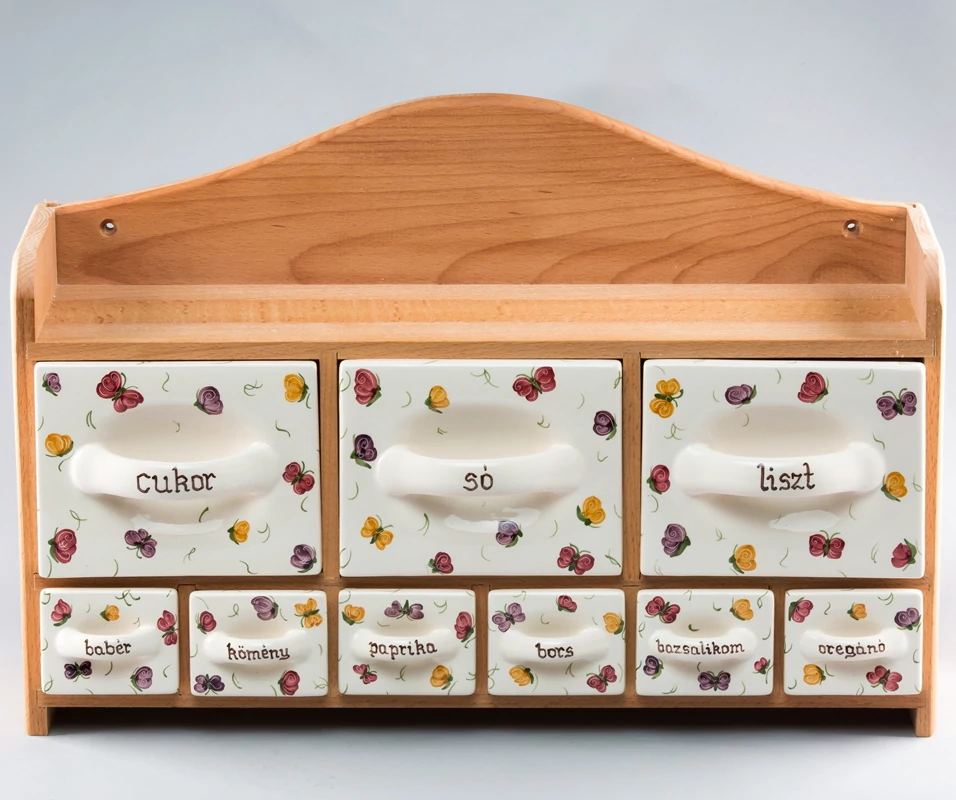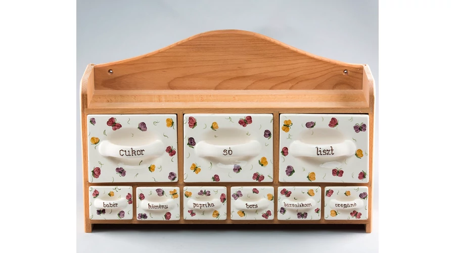 3 nagy és 6 kis fiókból álló fűszertartó-készlet, kézzel festett pillangós mintával, pácolt bükkfa tartóban. Méretek: szélesség 50 cm, magasság 36 cm, mélység 15 cm, súlya 9 kg. A feliratokat az Ön igényei szerint festjük rá. Kitűnő nászajándék ötlet önállóan is. |