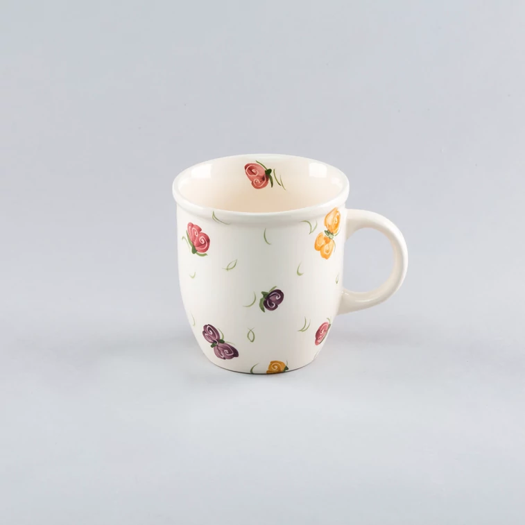 3 dl űrtartalmú kerámia bögre, 9,5 cm magas. Kézzel festett pillangós mintával. Mikrohullámú sütőbe tehető, és mosogatógépben tisztítható, mindennapos használatra alkalmas. Készletben remek ajándék születésnapra, vagy nászajándékba. 6 darab felett most kedvezőbb áron!
