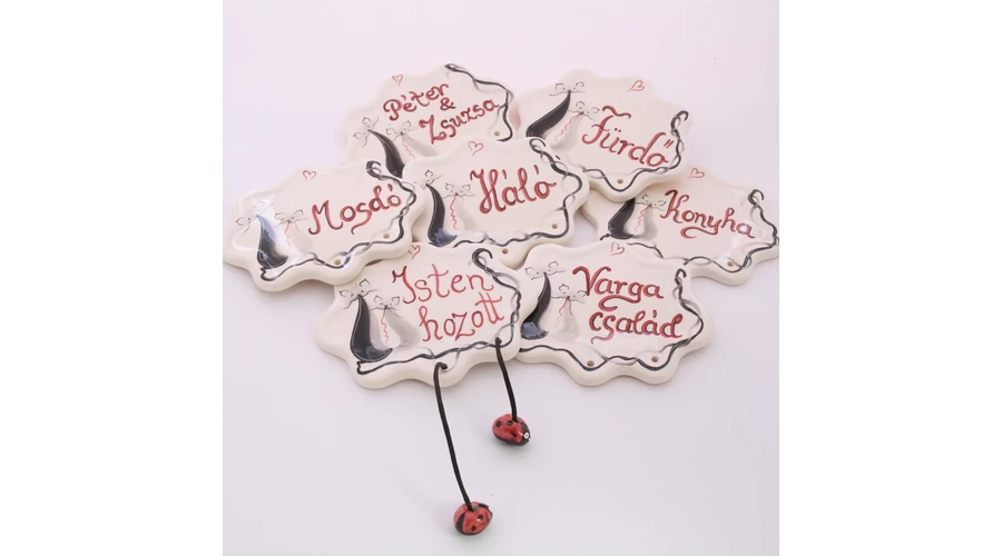 | Újdonság webáruházunkban! Ajtóra, vagy falra tehető 9x6 cm nagyságú kerámia tábla, kézzel festett cicás mintával, igény szerint rendelhető feliratokkal. Válasszon a két kivitel között: öntapadó ragasztócsíkkal, illetve felakasztható kivitelben is rendelhető. | |