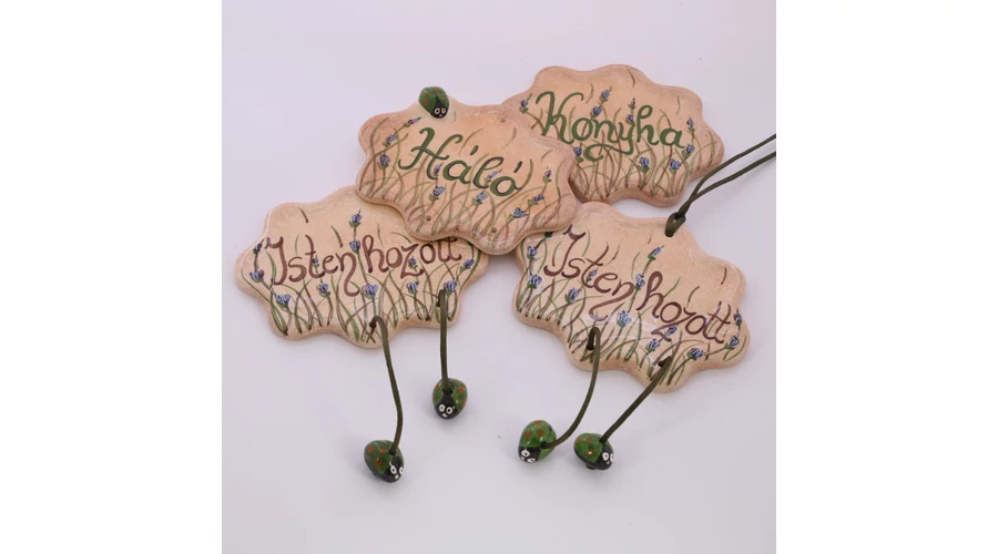 | Újdonság webáruházunkban! Ajtóra, vagy falra tehető 9x6 cm nagyságú kerámia tábla, kézzel festett levendulás mintával, igény szerint rendelhető feliratokkal. Válasszon a két kivitel között: öntapadó ragasztócsíkkal, illetve felakasztható kivitelben is rendelhető. | |