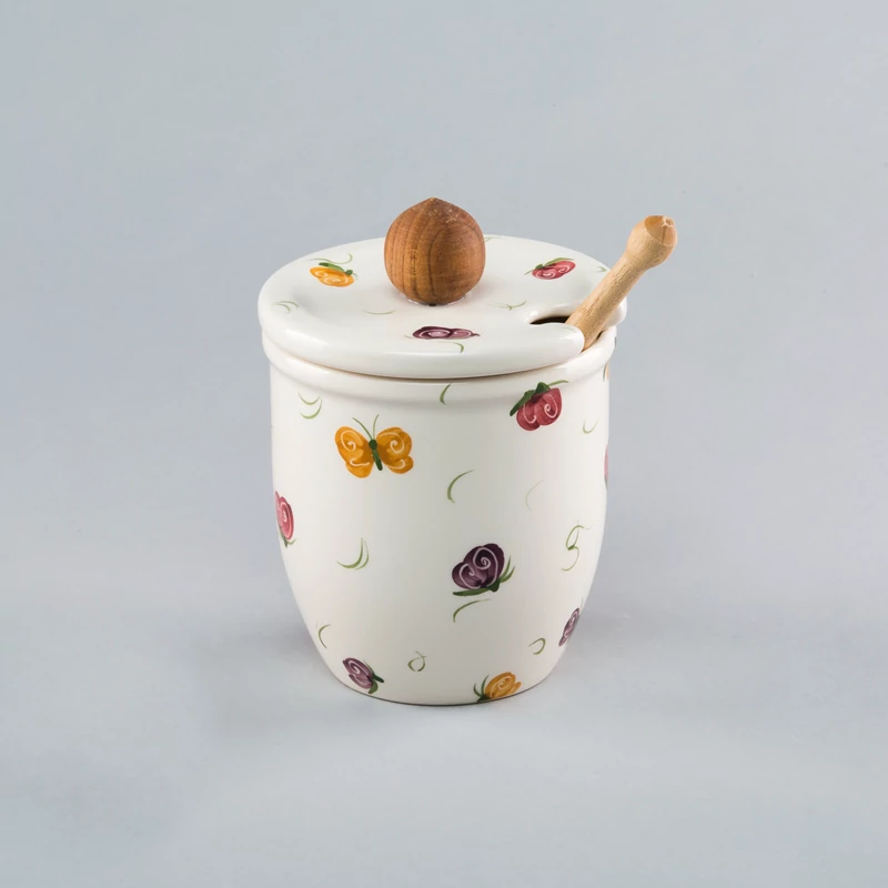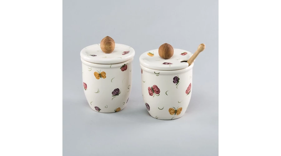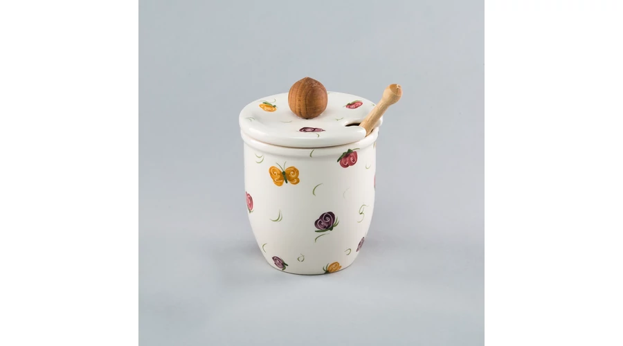 Kerámia méztartó kézzel festett pillangós mintával, körülbelül 30 dkg méz tárolásához, kerámia tetővel, fa fogantyúval és mézcsurgatóval. Magassága 11 cm. Egészítse ki bögréit, teáskészletét praktikus méztartónkkal! |