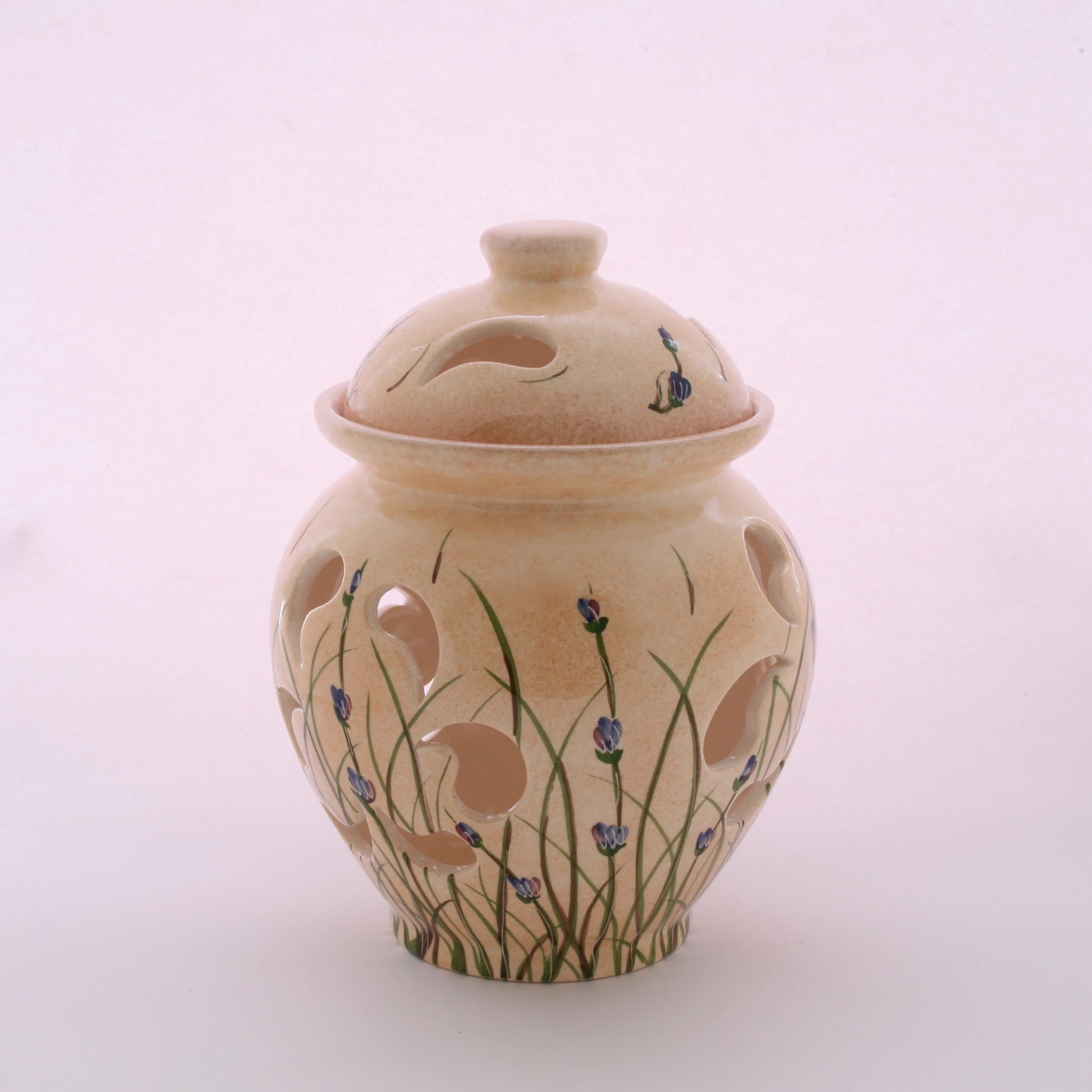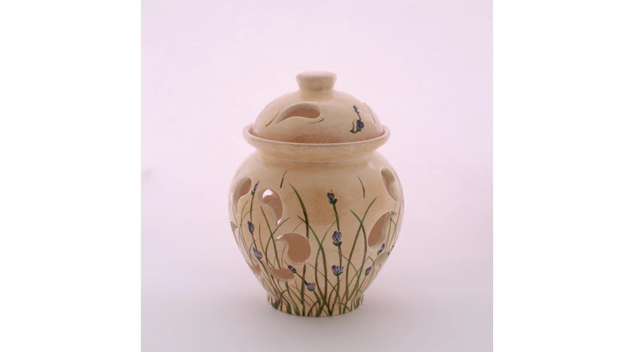 Kézzel festett levendulás mintájú kerámia hagymatartó. Magassága 22 cm, legnagyobb átmérője 17 cm.