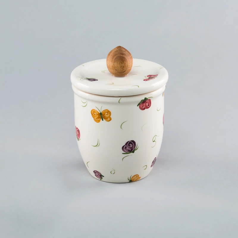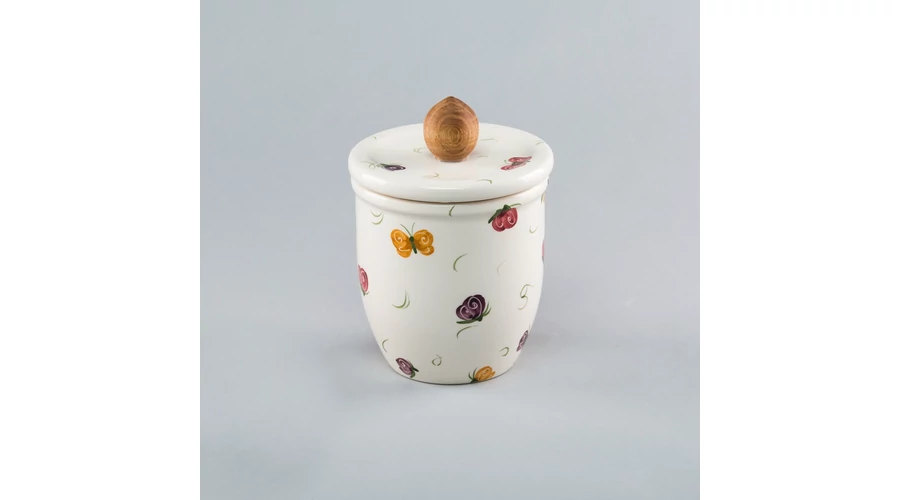 Kerámia cukortartó, magassága 11 cm, körülbelül 30 dkg cukor tárolásához, kerámia tetővel, fa fogantyúval. Kézzel festett pillangós mintával, ötletes kiegészítő teáskészletéhez.