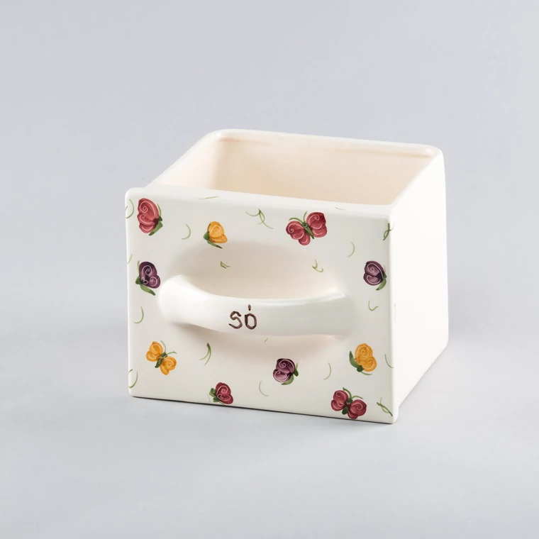 Kerámia fűszeres fiók, kézzel festett pillangós mintával, kb. egy kilogramm fűszerhez. Rendelje meg kívánság szerinti feliratozással, a feliratokat a rendelés során a "Megjegyzés" rovatba tudja beírni. A fiók méretei: szélesség 147 mm, magasság 116 mm, mélység 130 mm. |