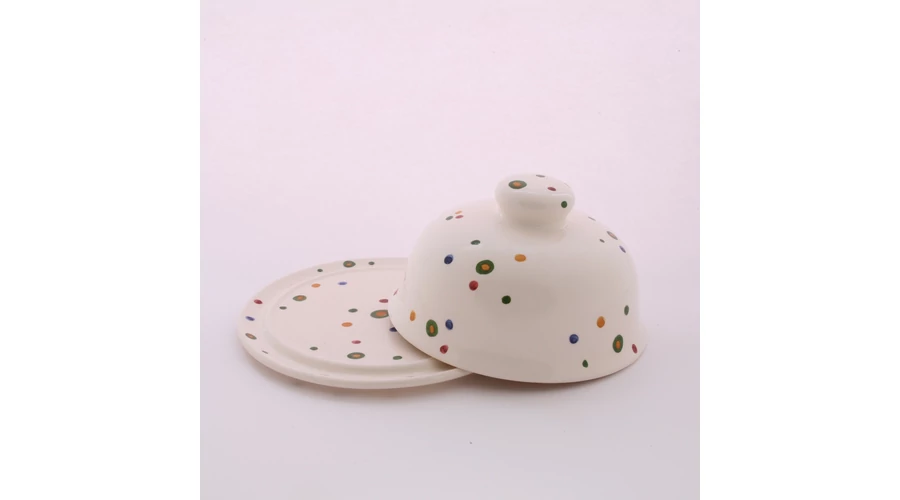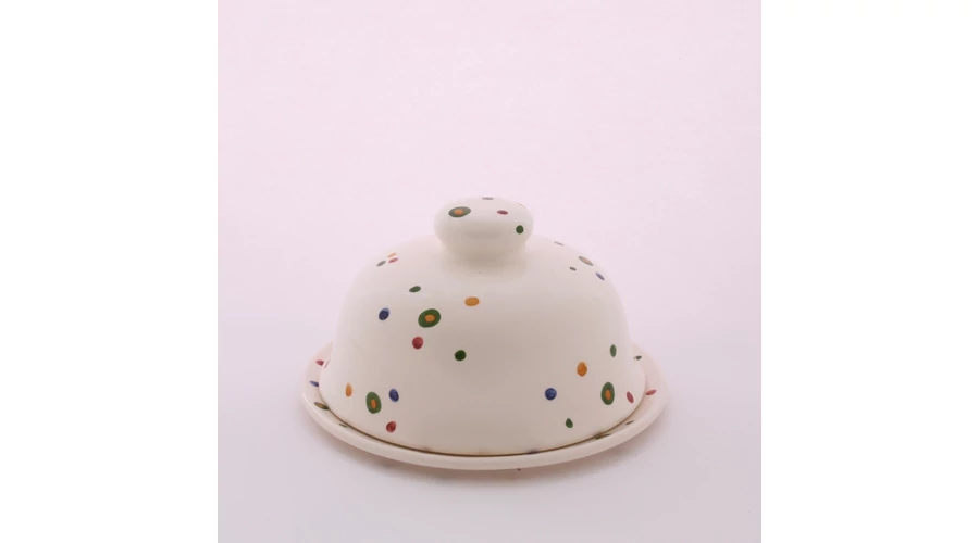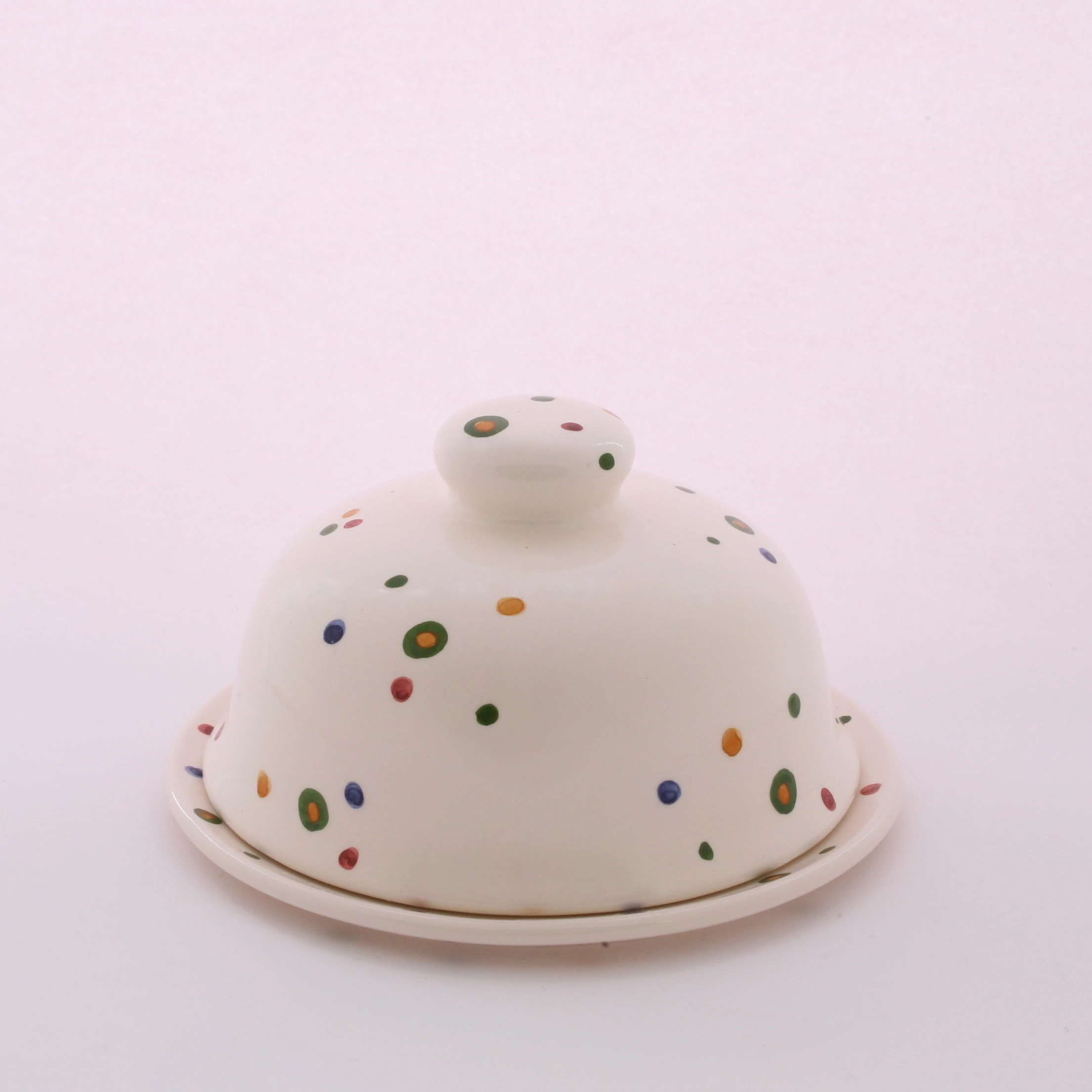 Kerek kerámia vajtartó, kézzel festett pöttyös mintával. Két részből áll, az alj átmérője 15 cm, a tető magassága 9 cm. |