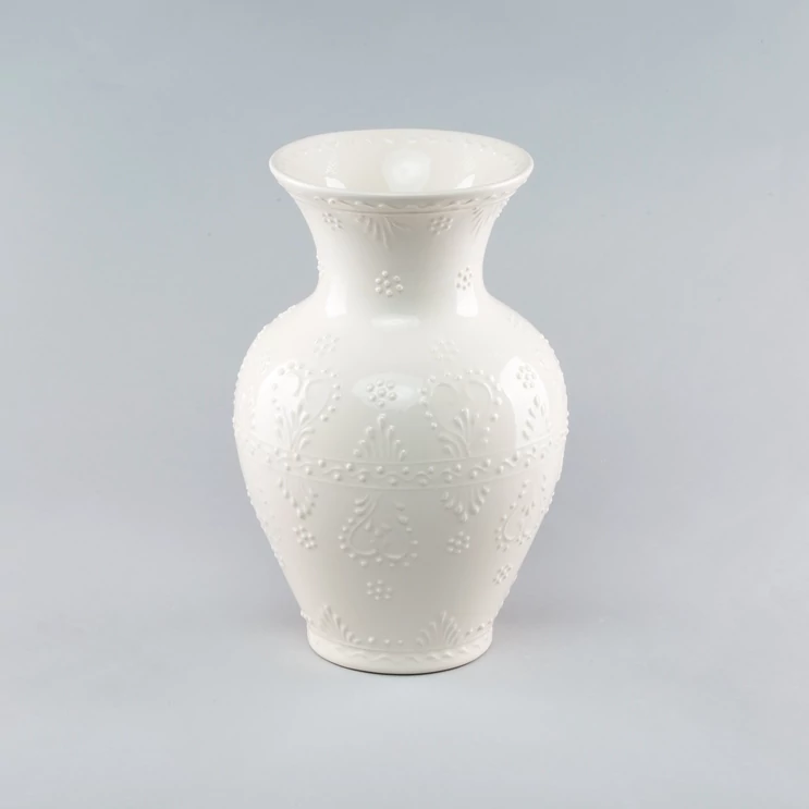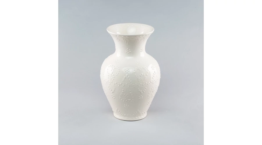 Kézzel festett, fehér írókás mintájú kerámia váza, magassága 25 cm. Önállóan is kitűnő ajándék szeretteinek. |