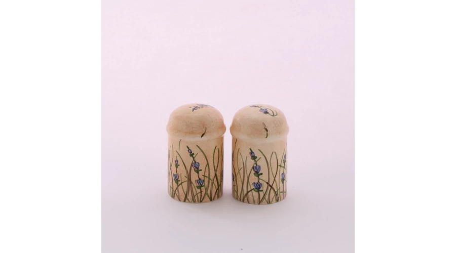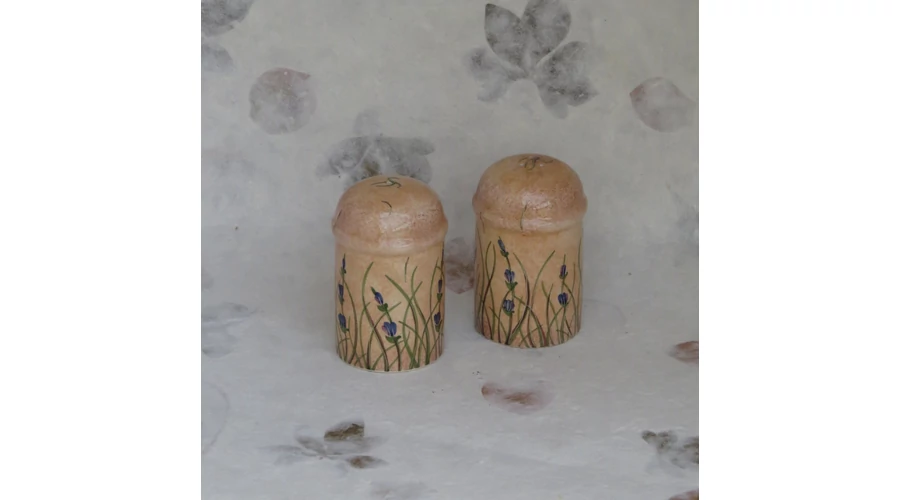 Kézzel festett levendulás mintás kerámia só és bors szóró. Magassága 9 cm. Apró kiegészítők levendulás készletéhez a konyhába. |