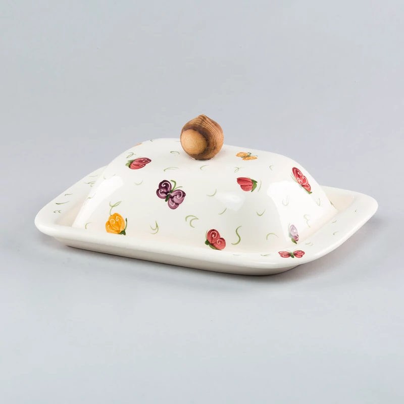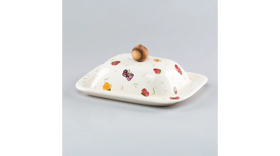 Újdonság webáruházunkban! Szögletes kerámia vajtartó fa fogantyúval, kézzel festett pillangós mintával. Két részből áll, az alj hosszúsága 20 cm, szélessége 13 cm, a tető magassága 9 cm. Önállóan is kiváló ajándék ötlet. |