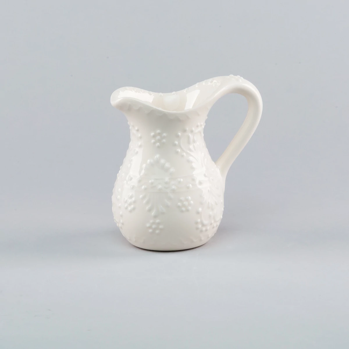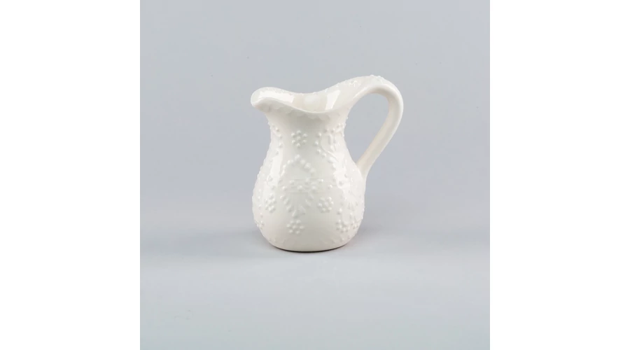 Fehér írókás mintájú kerámia tejkiöntő, kézzel festett, 1,5 dl űrtartalmú, magassága 10 cm. Praktikus kiegészítő teáskészletéhez. |