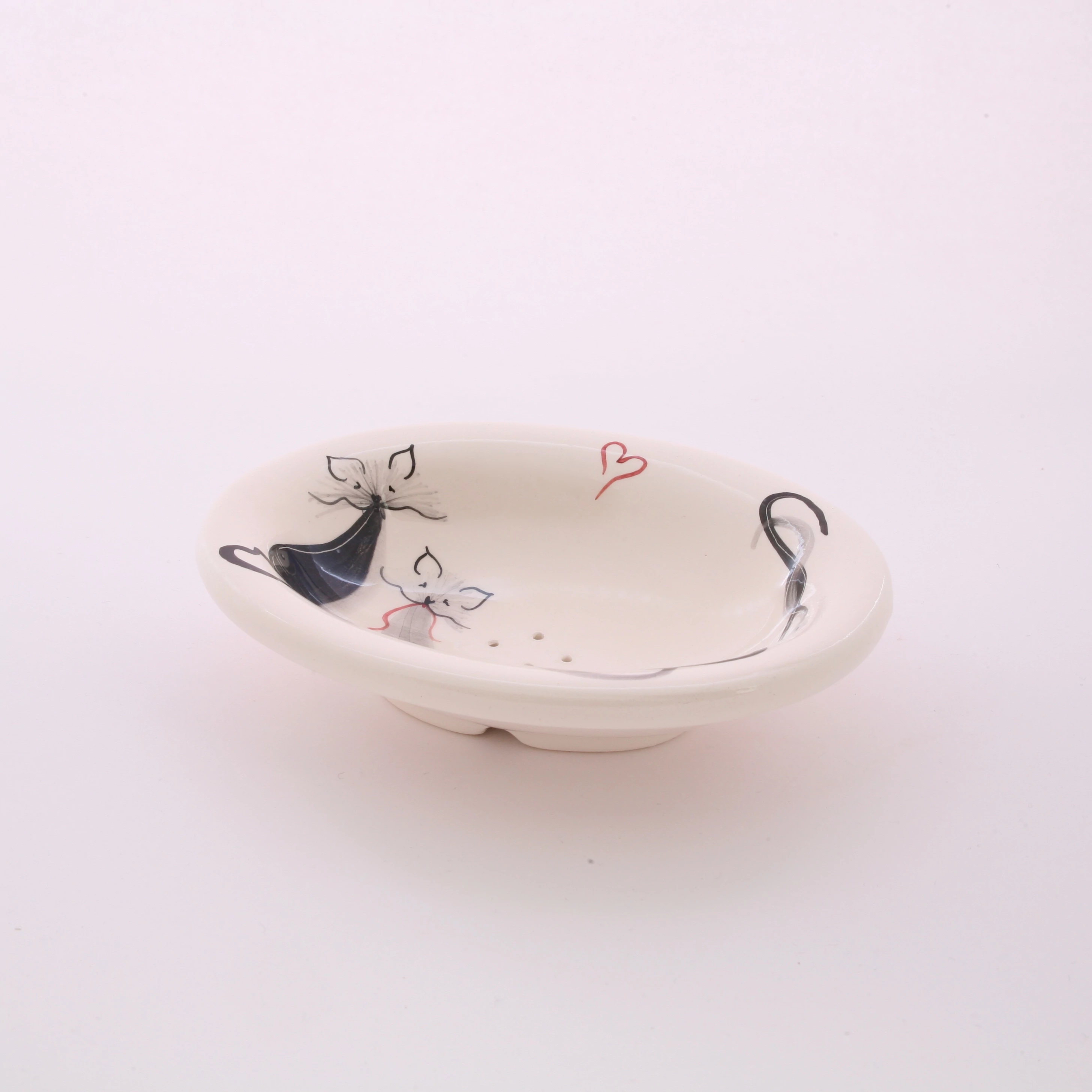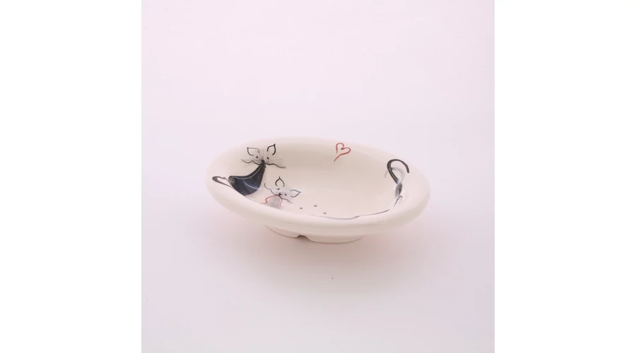 Ovális kerámia szappantartó, kézzel festett cicás mintával. 13*11 cm méretű, kisebb méretű szappanokhoz. |
