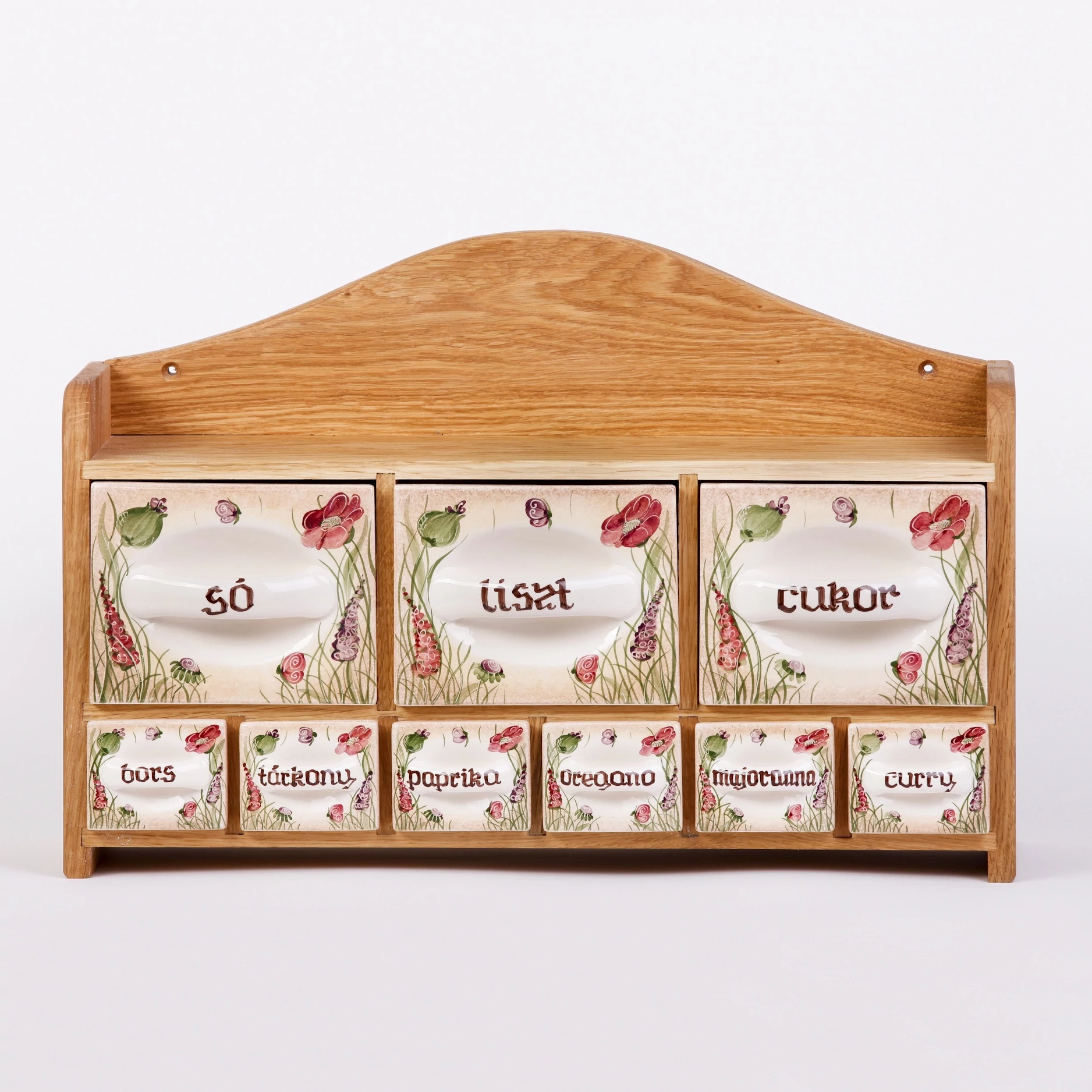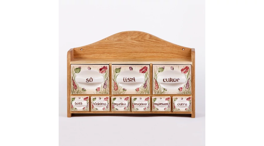 3 nagy és 6 kis fiókból álló fűszertartó-készlet, kézzel festett pipacsos mintával, pácolt bükkfa tartóban. Méretek: |
