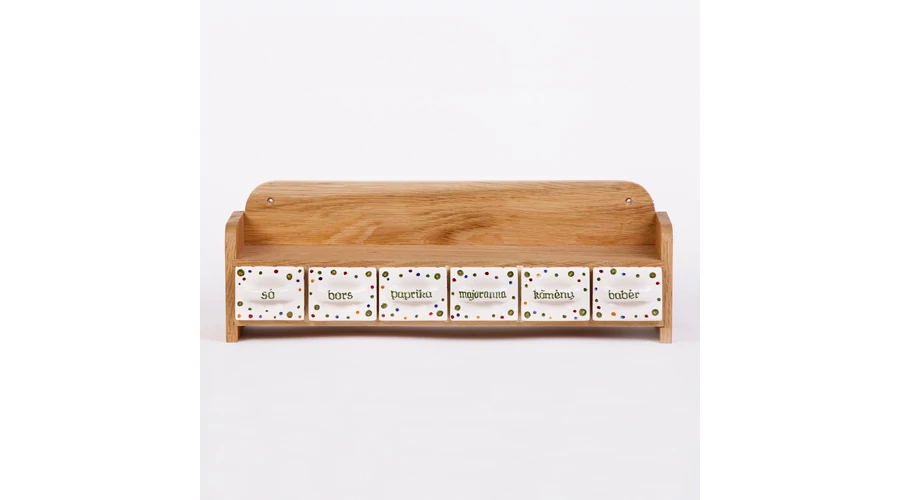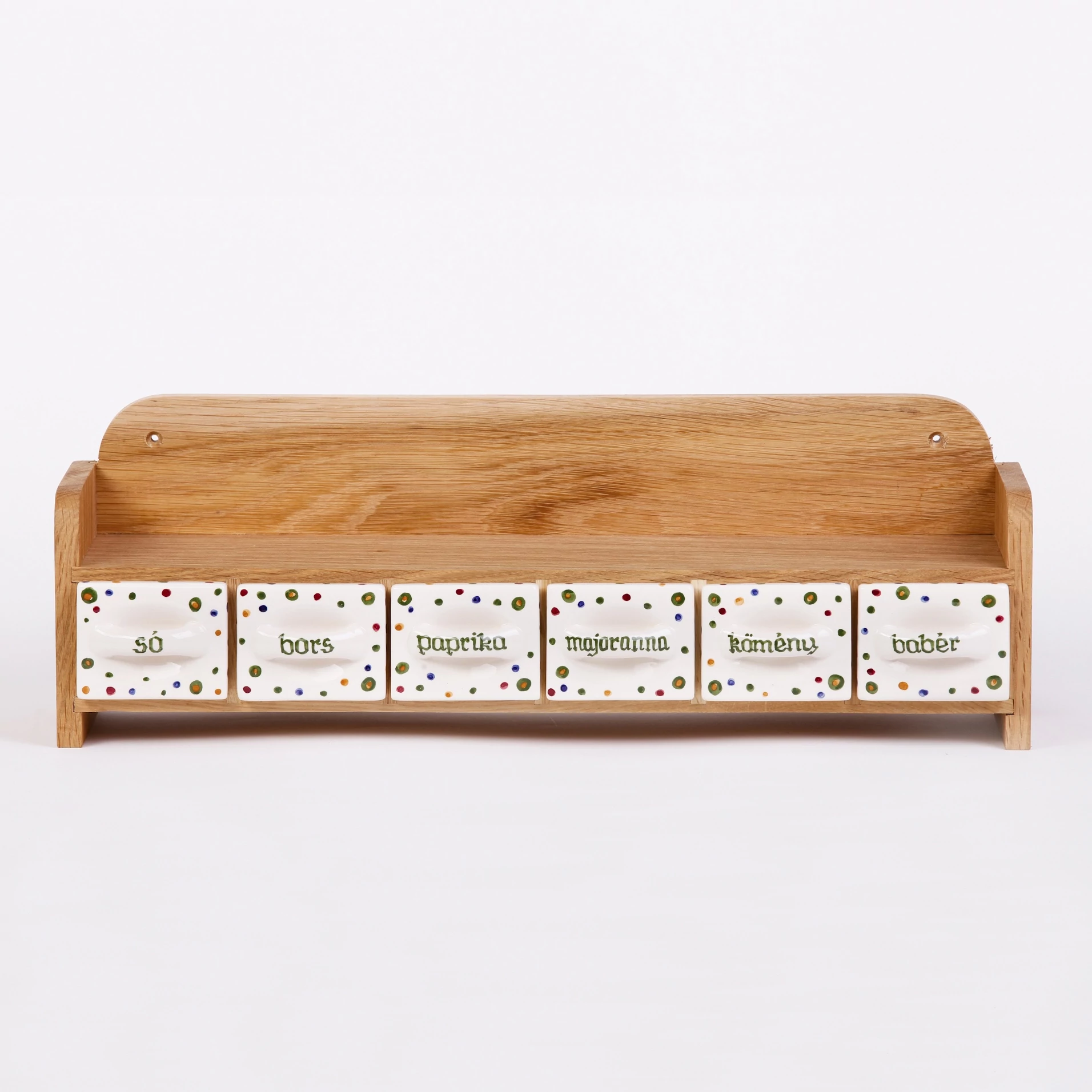 | Fiókos fűszertartó pöttyös mintával, 6 kerámia fiókkal, amelyeket az Ön igénye szerinti feliratokkal festünk meg. Egy fűszer fiók körülbelül 15-20 dkg fűszer tárolására alkalmas. Bükkfából készült, pácolt tartóval. Méretei: szélesség 50 cm, magasság (hátlappal) 17 cm, mélység 14 cm. A kerámia fűszer fiókok külön is megvásárolhatóak. | |