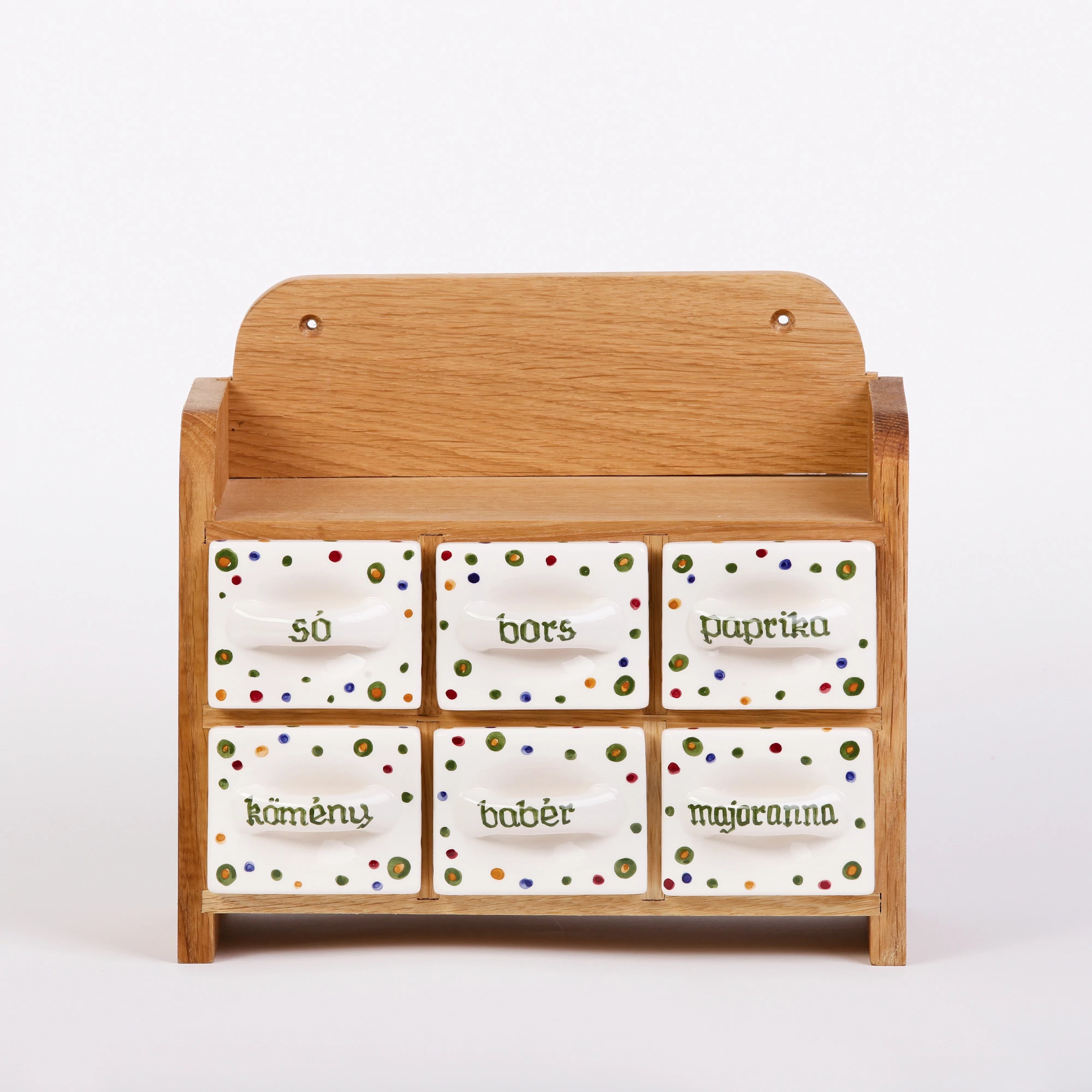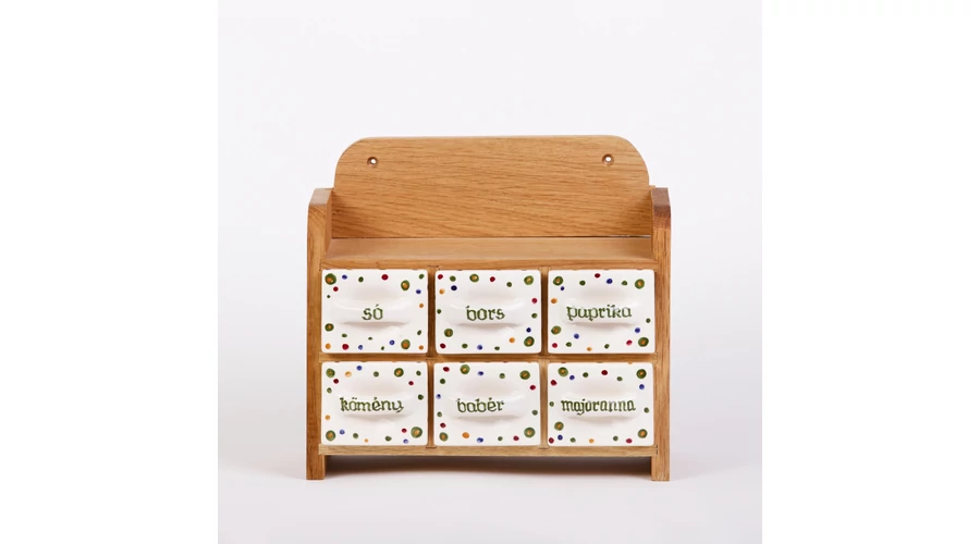 | Kézzel festett, pöttyös mintájú, kerámia fiókos fűszertartó. Pácolt bükkfa tartóval. 25 cm széles, 24 cm magas, 12 cm mély. Rendelje meg saját kedvenc fűszereivel feliratozva! Önállóan is kitűnő nászajándék ötlet. | |