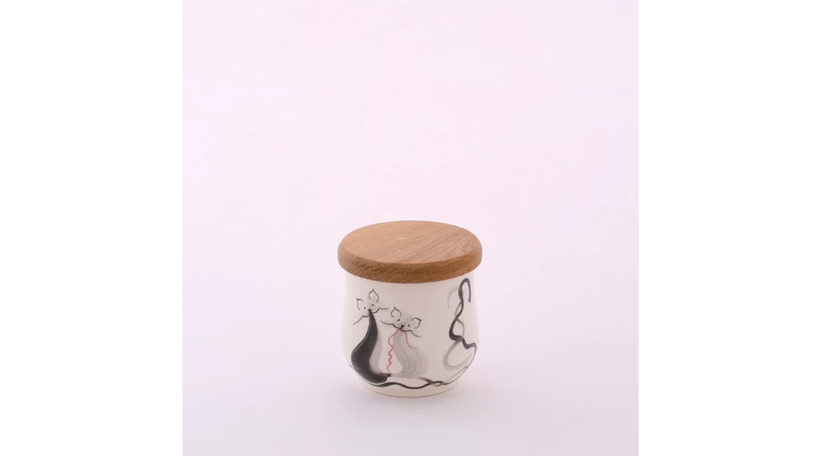 Kerámia cukortartó, magassága 9 cm, körülbelül 20 dkg cukor tárolásához, pácolt bükkfa tetővel. Magyar kézműves termék, kézzel festett cicás mintával. Kiegészítőként ajánljuk teáskészletéhez.