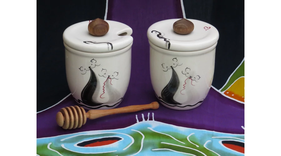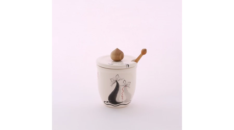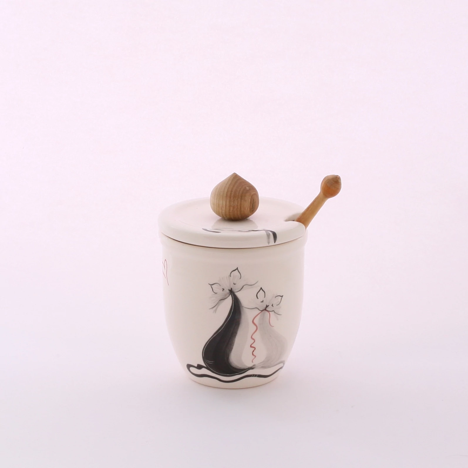 Kerámia méztartó kézzel festett cicás mintával, körülbelül 30 dkg méz tárolásához, kerámia tetővel, fa fogantyúval és mézcsurgatóval. Magassága 11 cm. Egészítse ki bögréit, teáskészletét praktikus méztartónkkal! |