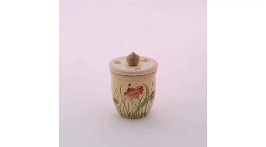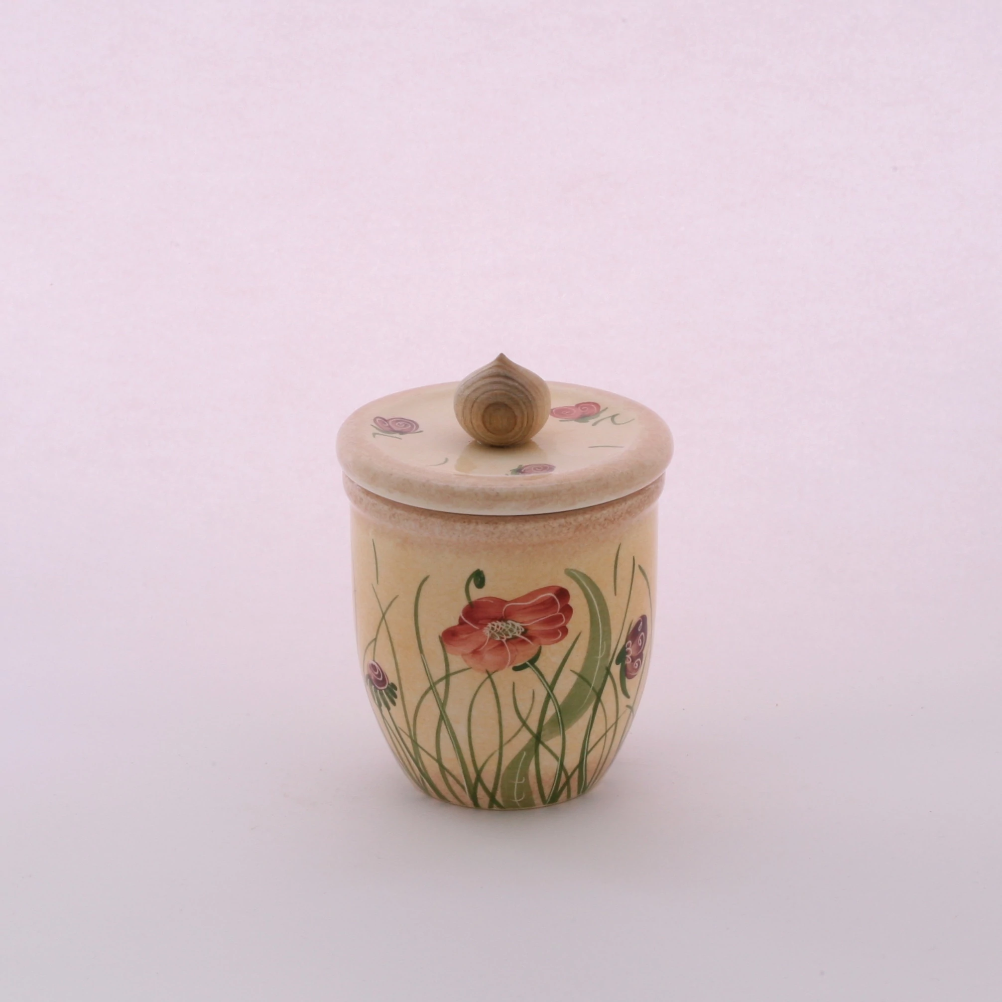 Kerámia cukortartó, magassága 11 cm, körülbelül 30 dkg cukor tárolásához, kerámia tetővel, fa fogantyúval. Kézzel festett pipacsos mintával, ötletes kiegészítő teáskészletéhez.
