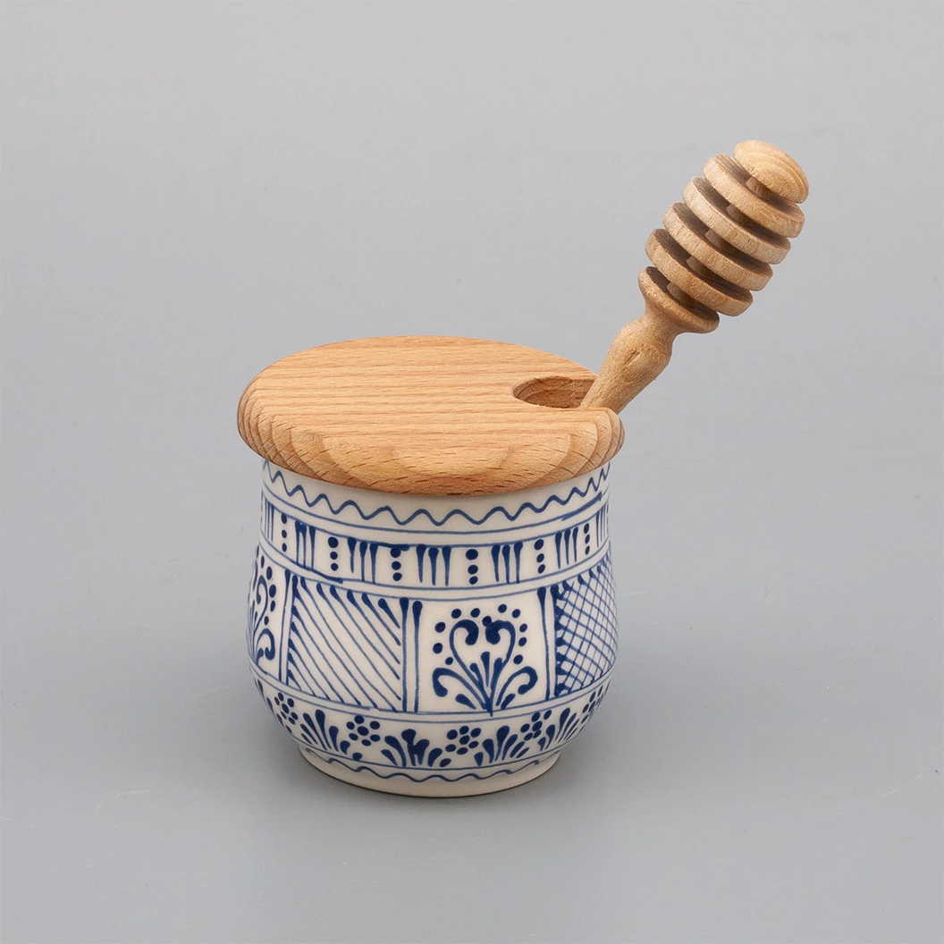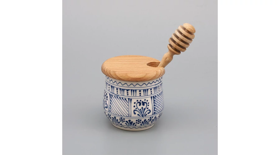 Kerámia méztartó, körülbelül 20 dkg méz tárolásához, pácolt bükkfa tetővel és mézcsurgatóval. Kézzel festett irókás mintával praktikus kiegészítő teáskészletéhez. |