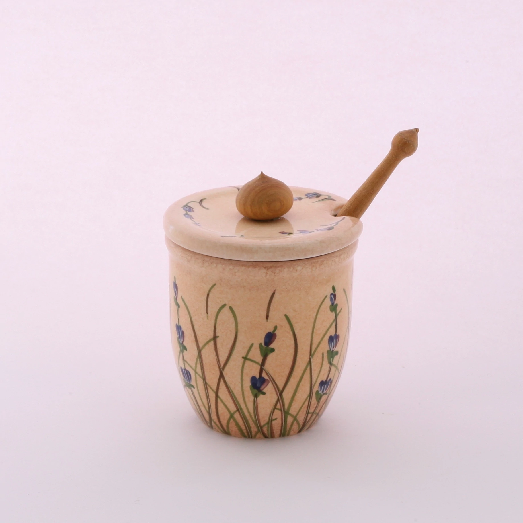 Kerámia méztartó kézzel festett levendulás mintával, körülbelül 30 dkg méz tárolásához, kerámia tetővel, fa fogantyúval és mézcsurgatóval. Magassága 11 cm. Egészítse ki bögréit, teáskészletét praktikus méztartónkkal! |