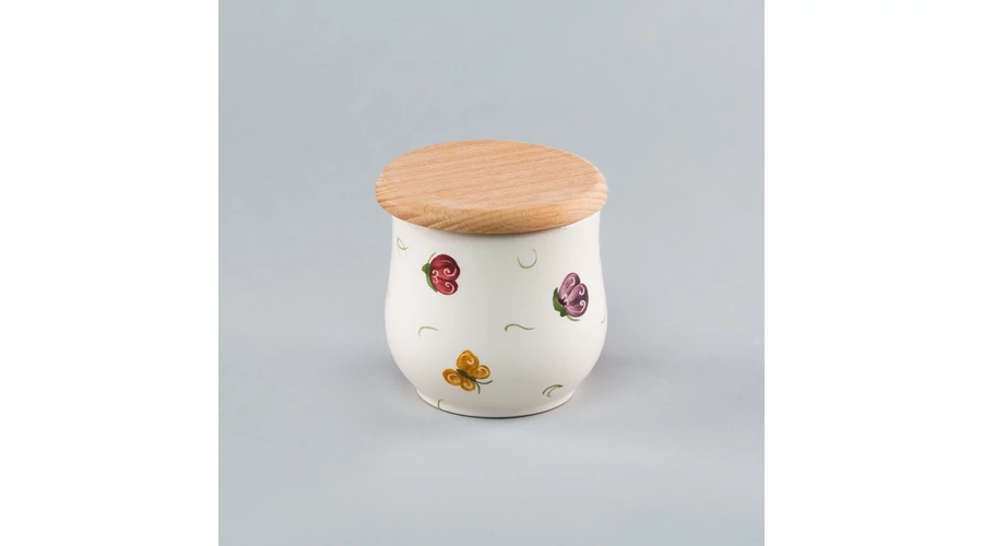 Kerámia cukortartó, magassága 9 cm, körülbelül 20 dkg cukor tárolásához, pácolt bükkfa tetővel. Magyar kézműves termék, kézzel festett pillangós mintával. Kiegészítőként ajánljuk teáskészletéhez. |