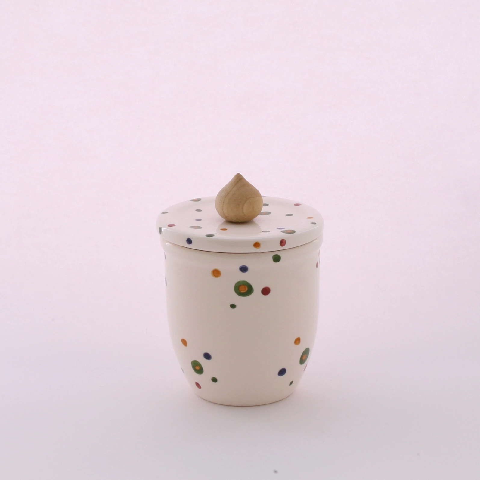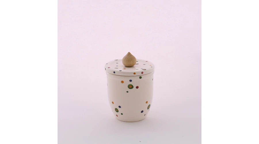 Kerámia cukortartó, magassága 11 cm, körülbelül 30 dkg cukor tárolásához, kerámia tetővel, fa fogantyúval. Kézzel festett pöttyös mintával, ötletes kiegészítő teáskészletéhez. |