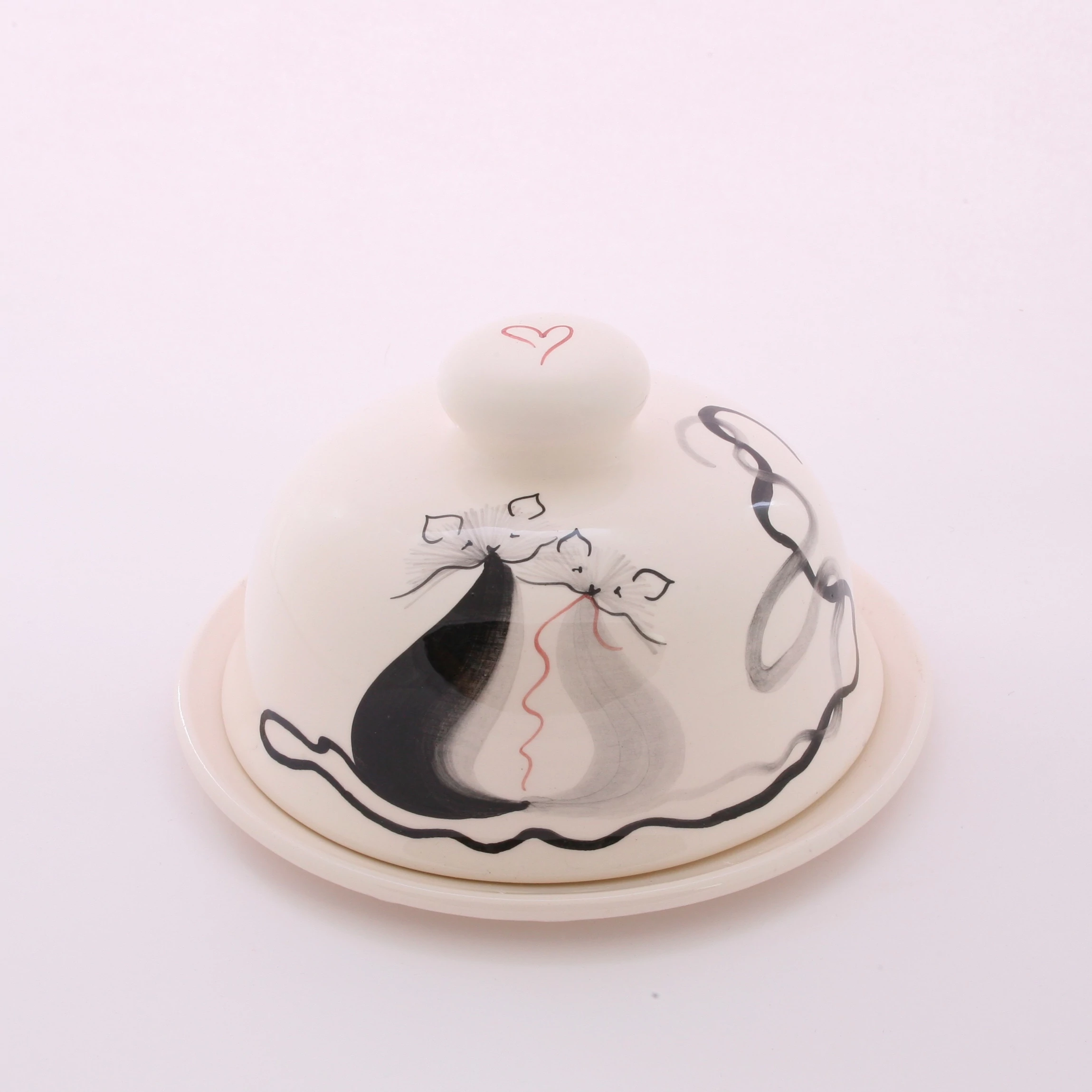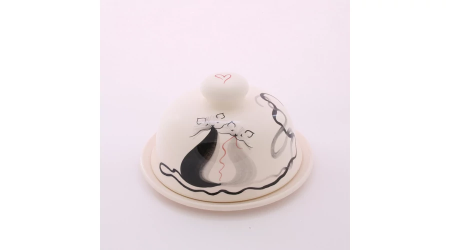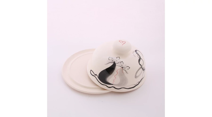 Kerek kerámia vajtartó, kézzel festett cicás mintával. Két részből áll, az alj átmérője 15 cm, a tető magassága 9 cm. |