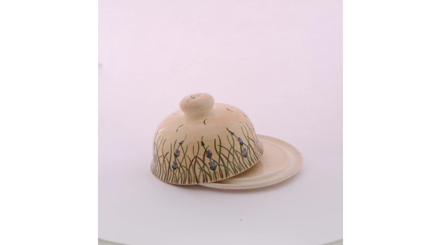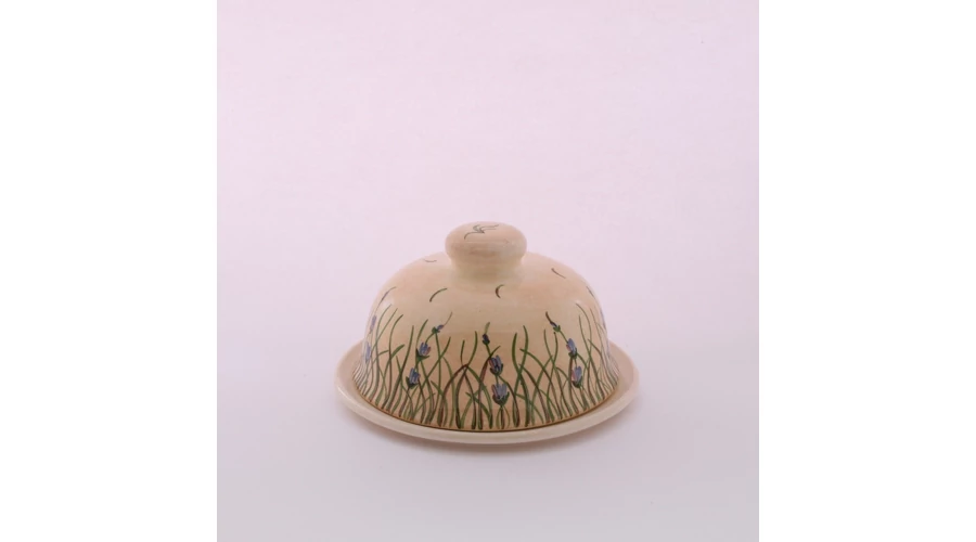Kerek kerámia vajtartó, kézzel festett levendulás mintával. Két részből áll, az alj átmérője 15 cm, a tető magassága 9 cm. |